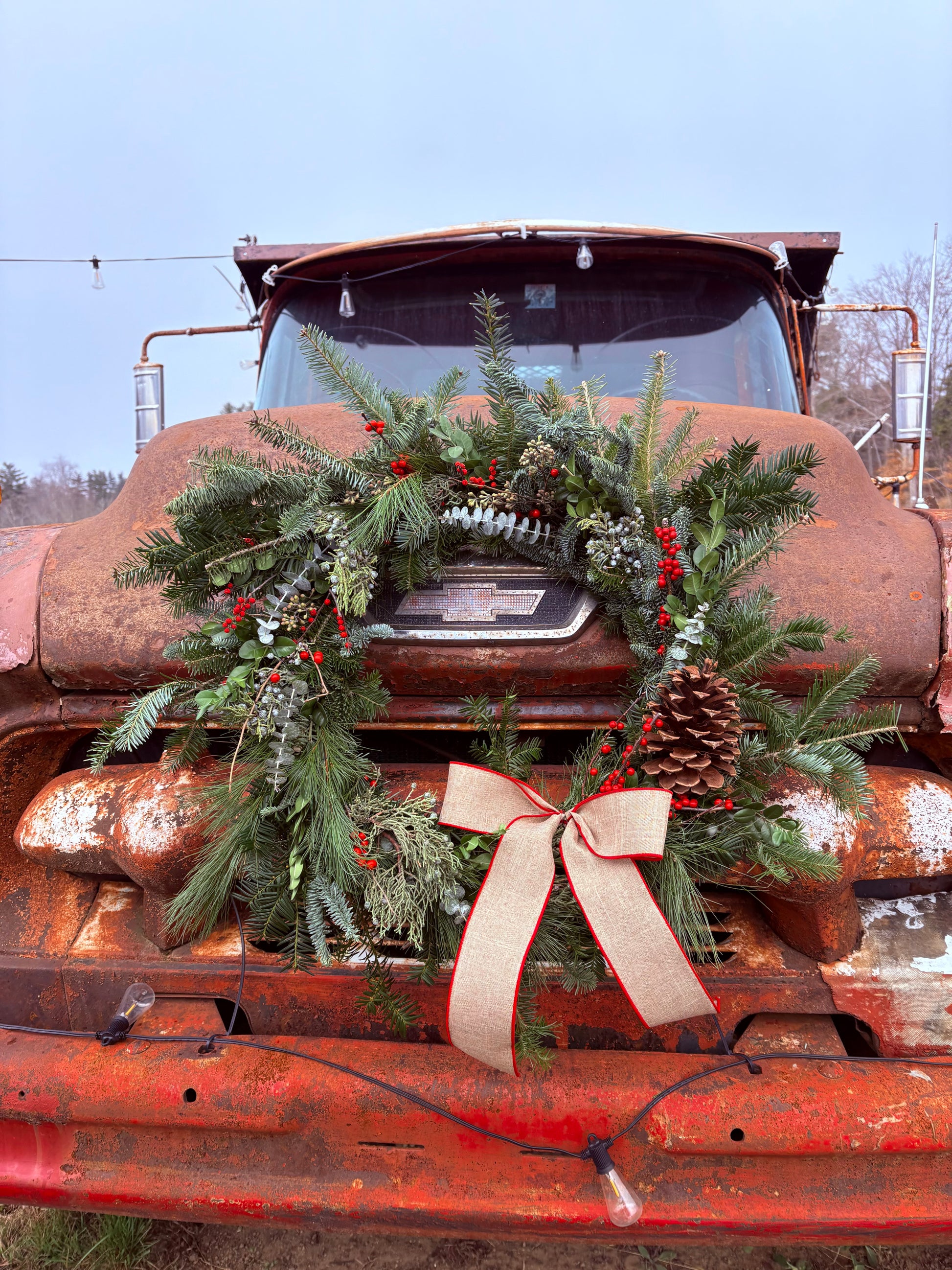 Every wreath is created by hand using a mix of pine, cedar, fir, spruce, and seasonal berries gathered right here at the farm.
